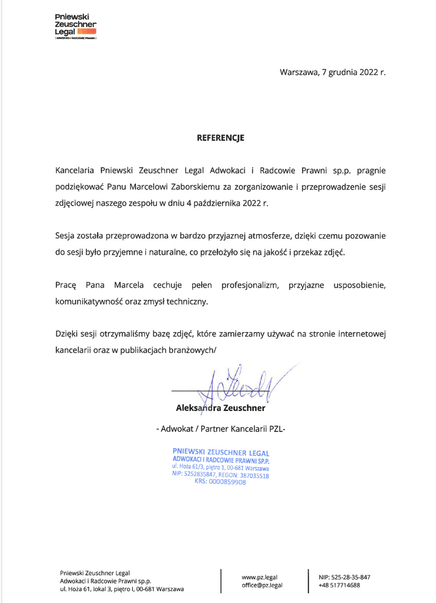 Kancelaria Pniewski Zeuschner Legal Adwokaci i Radcowie Prawni sp. p. pragnie podziękować Panu Marcelowi Zaborskiemu za zorganizowanie i przeprowadzenie sesji zdjęciowej naszego zespołu w dniu 4 października 2022