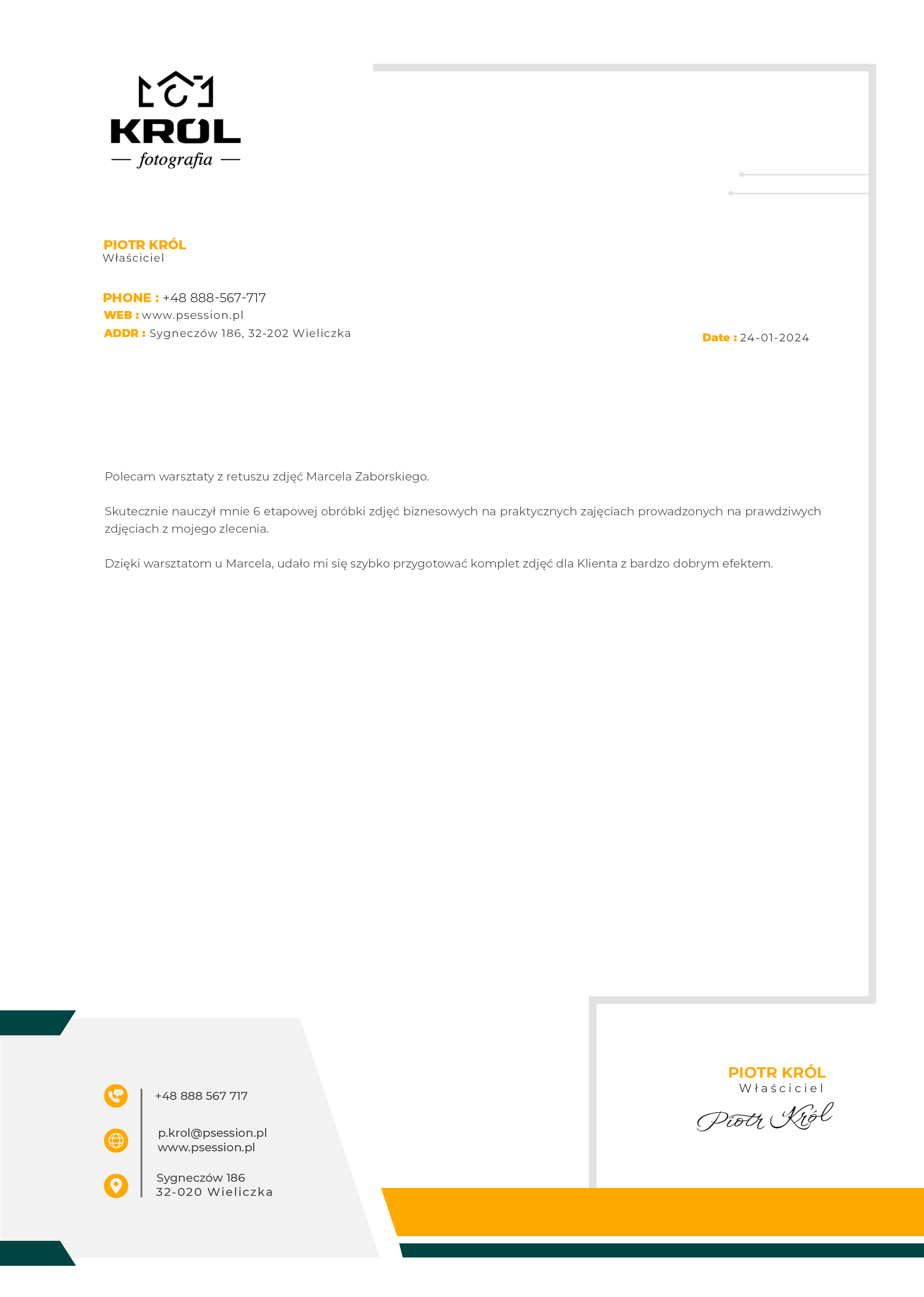 Skutecznie nauczył mnie 6 etapowej obróbki zdjęć biznesowych na praktycznych zajęciach prowadzonych na prawdziwych zdjęciach z mojego zlecenia.